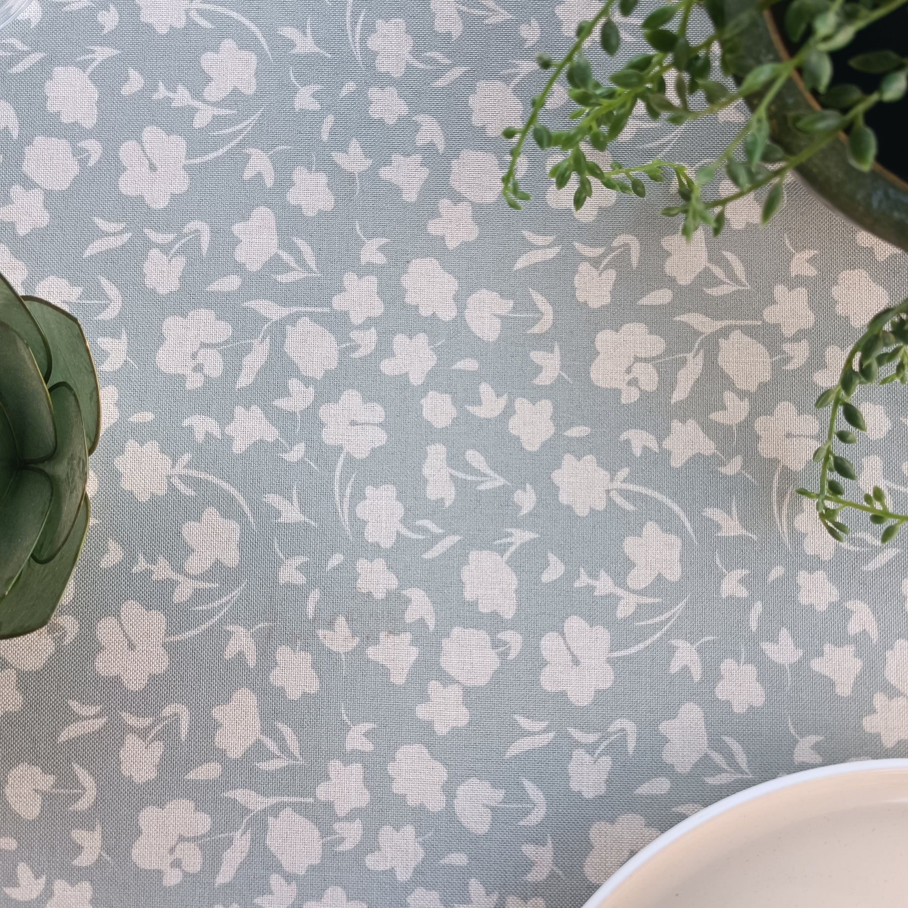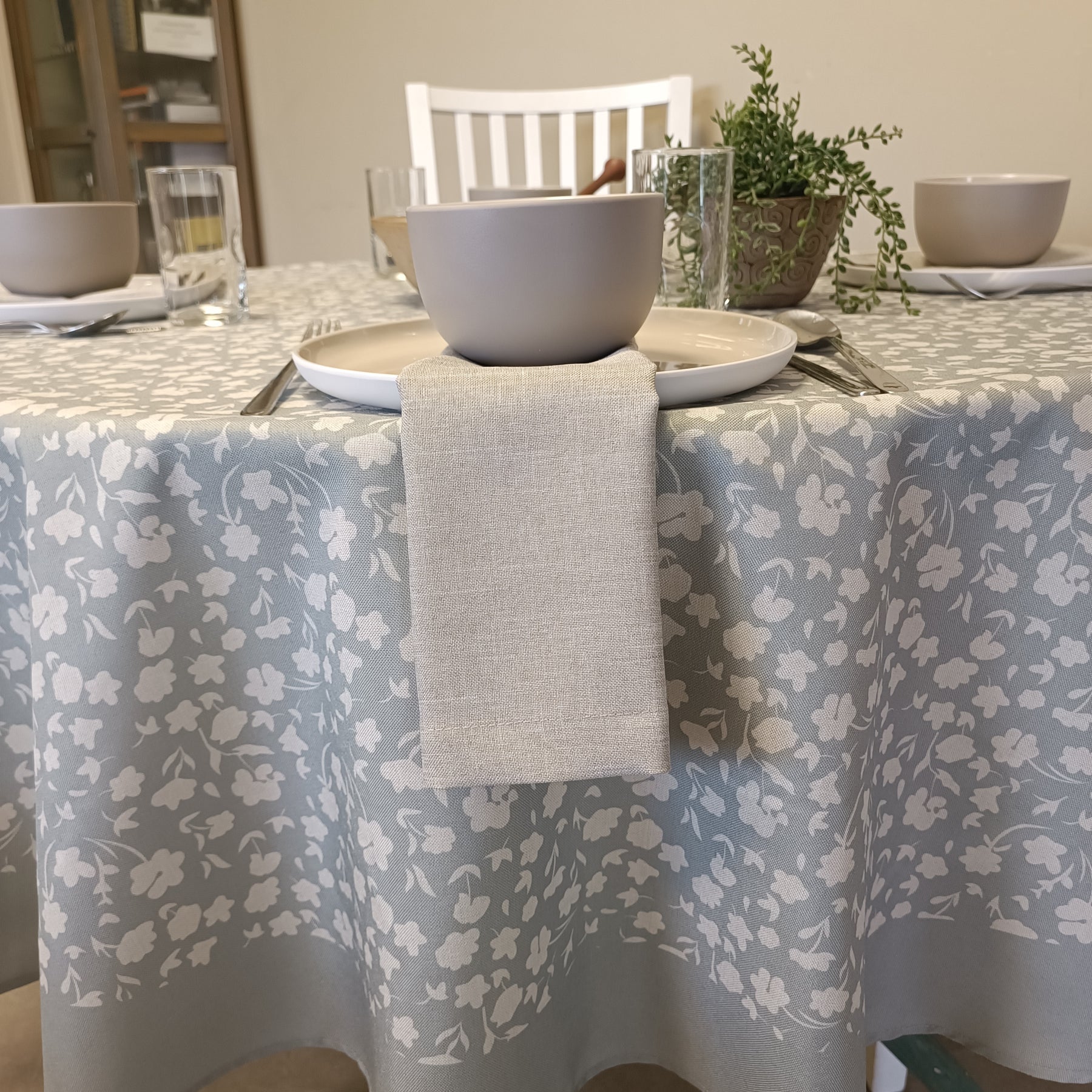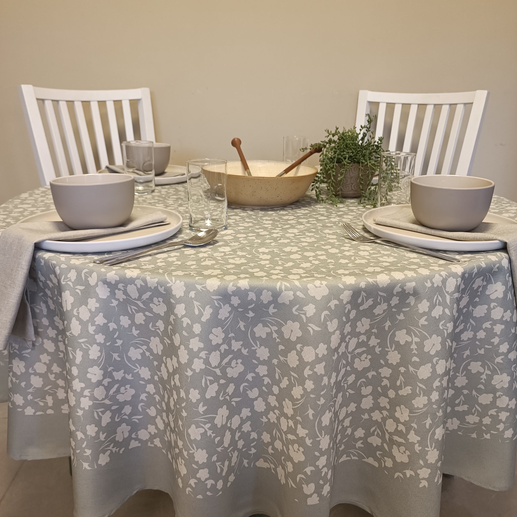 מפת שולחן פרחונית, רכה ומלאת חיים, בהשראת שדות פורחים וימי אביב נעימים. הדפס עדין בצבע ירקרק מרענן מעניק לכל שולחן מראה טבעי ומזמין. הבד מדמה פשתן יוקרתי אך עשוי 100% פוליאסטר – עמיד, נוח לשימוש, וקל לניקוי.